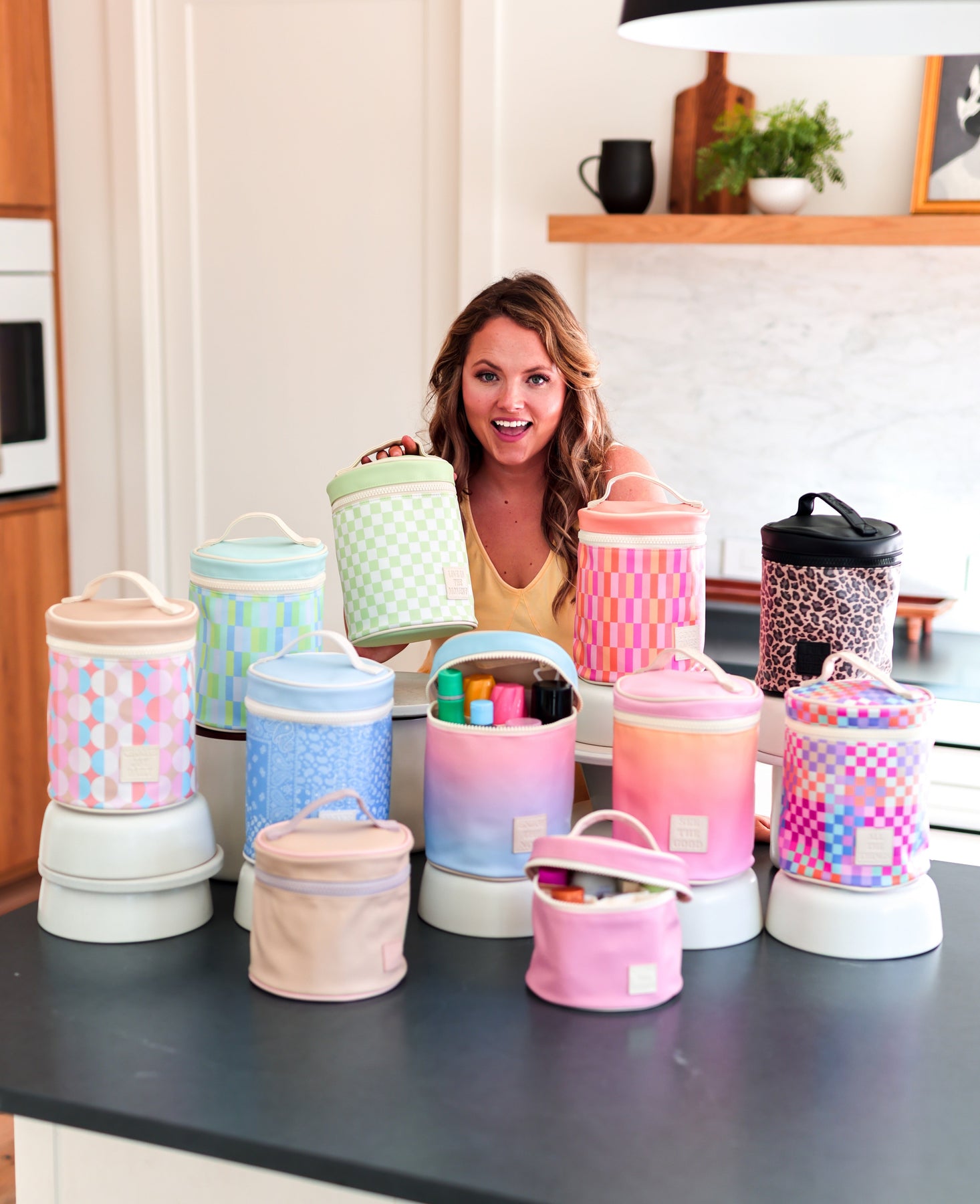 Colorful gradient storage container with zip closure and top handle, perfect for organizing essentials.