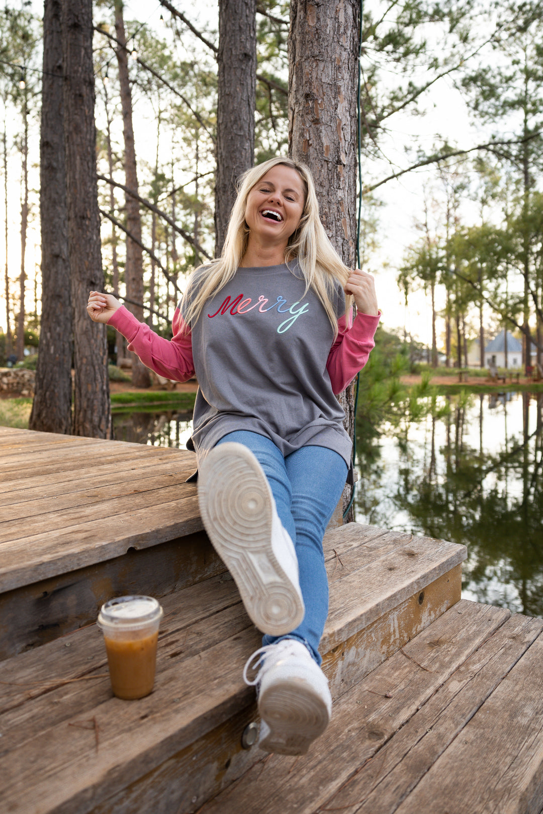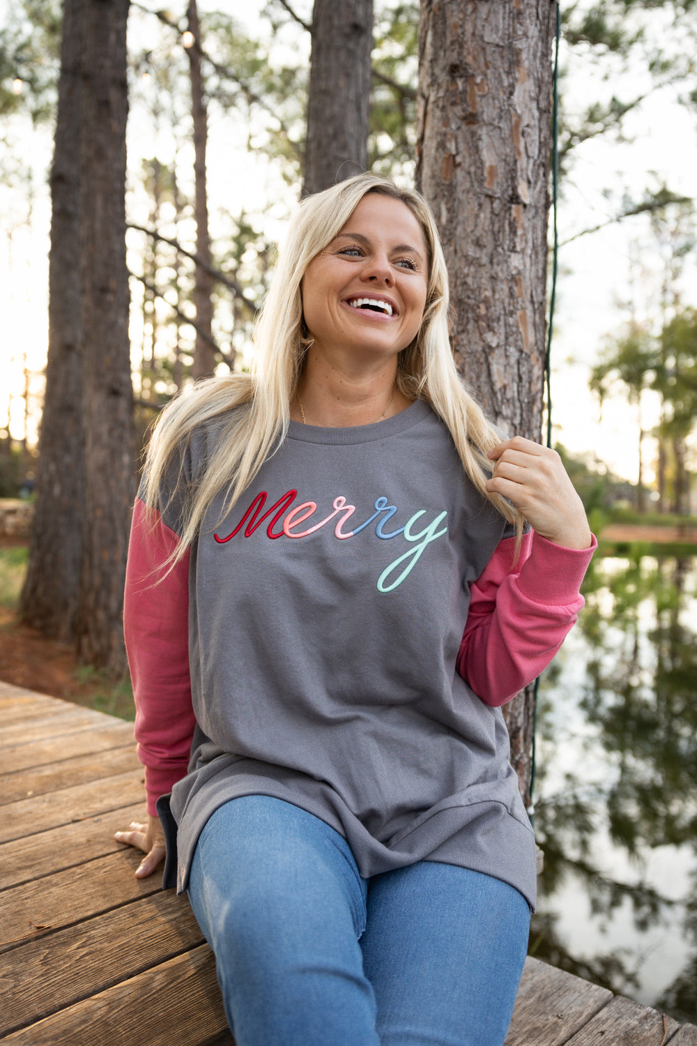 3D Embroidery Merry (Grey/Vintage Red) - Light Weight Color Block Sweatshirt