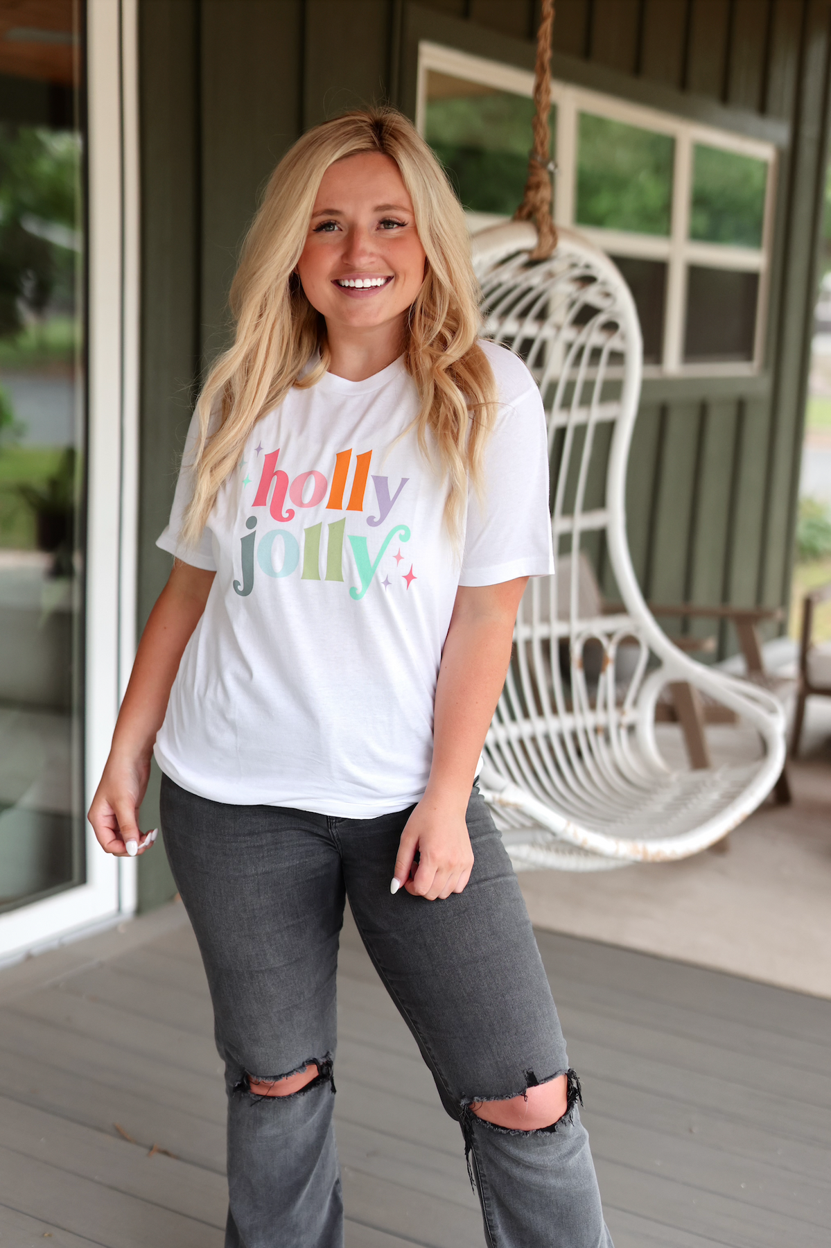 Time to embrace your festive spirit with our super cute Holly Jolly tee!  Made with the softest cotton that will be comfy and fun for anything from Christmas shopping to casual get togethers.