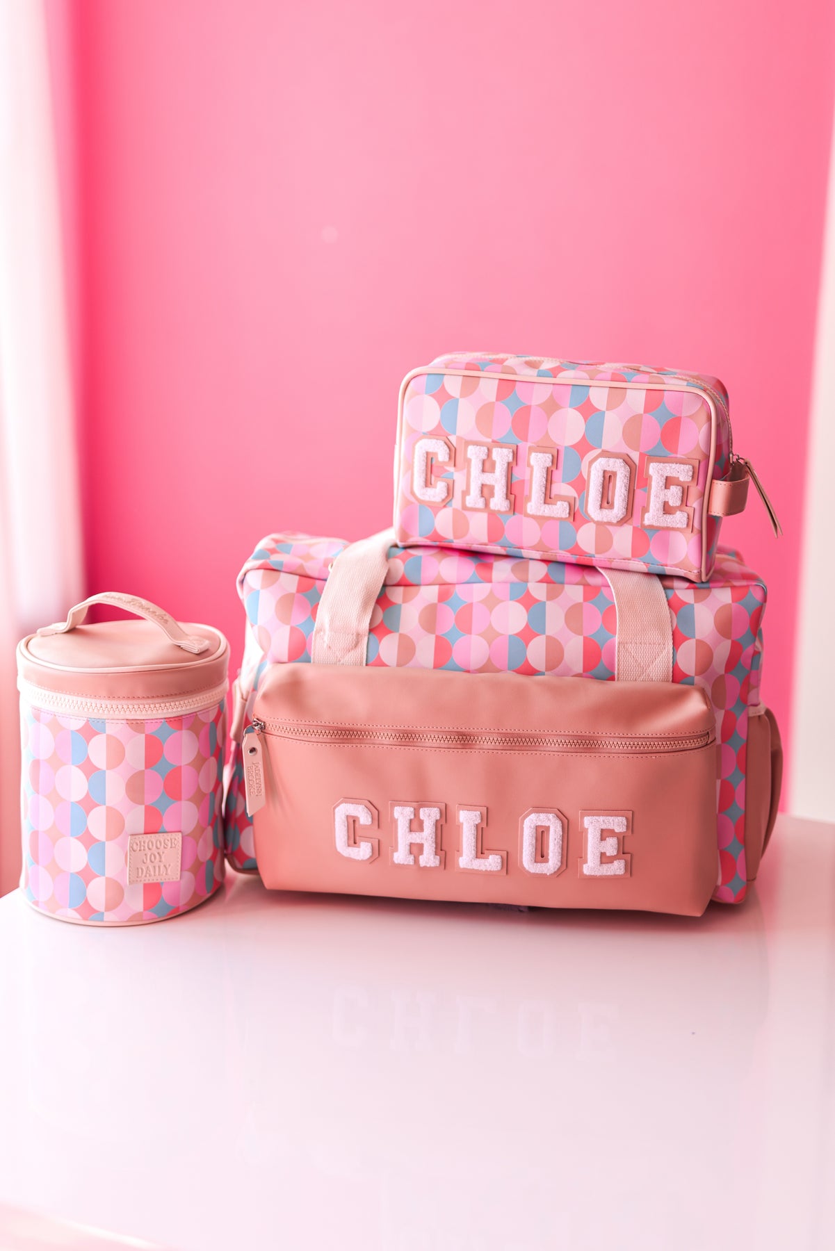 Colorful Chloe travel bag set including a duffel, toiletry bag, and container in pink and geometric patterns.